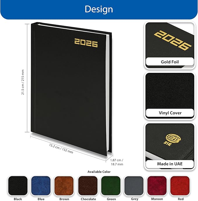 - Quality materials within a practical format: Durable hard cover in a classic black vinyl finish on an A5 diary.