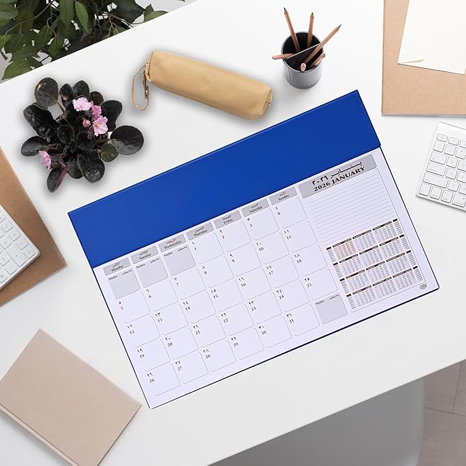 Practical benefits include a large writing area on a 490x340 mm format and a bilingual Arabic-English layout, which supports planning and readability for users who operate in both languages. The blue PVC cover adds a durable, desk-ready exterior suitable for frequent handling in office, study, or home environments. The 2026 year specification aligns with annual planning needs.