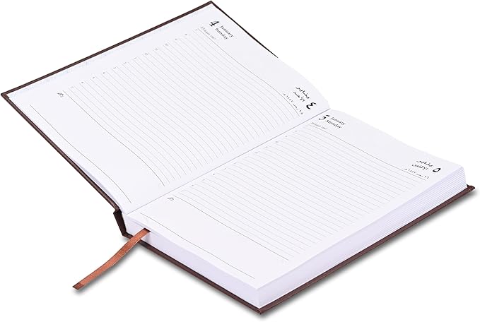 This product is an A5 diary with Arabic-English bilingual content, bound in a hard cover made of vinyl. It is suitable for individuals who require a year-specific planning tool in two languages and value a durable, portable notebook for daily use in 2026.
