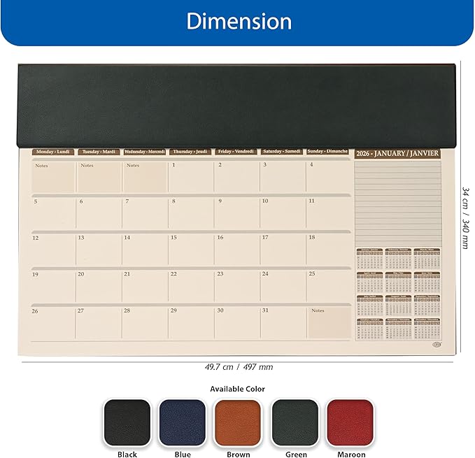 Key factors that support buyer intent include the large, practical format (490x340 mm) for extensive planning, the bilingual English-French content, and the durable PU cover with a flap. The 2026 year framing provides a time-specific planning tool, and the green exterior offers a low-maintenance, professional appearance.
