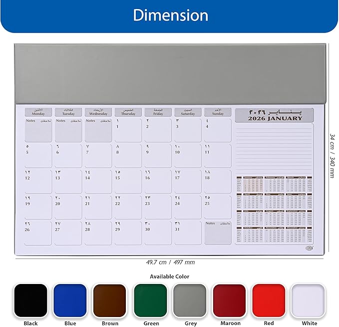 Key factors that may influence a purchasing decision include its year-specific 2026 planning, bilingual Arabic-English layout, and the durable, professional grey PVC cover. The 490x340 mm size provides practical writing space, making it a versatile desk companion for users who work in both languages.