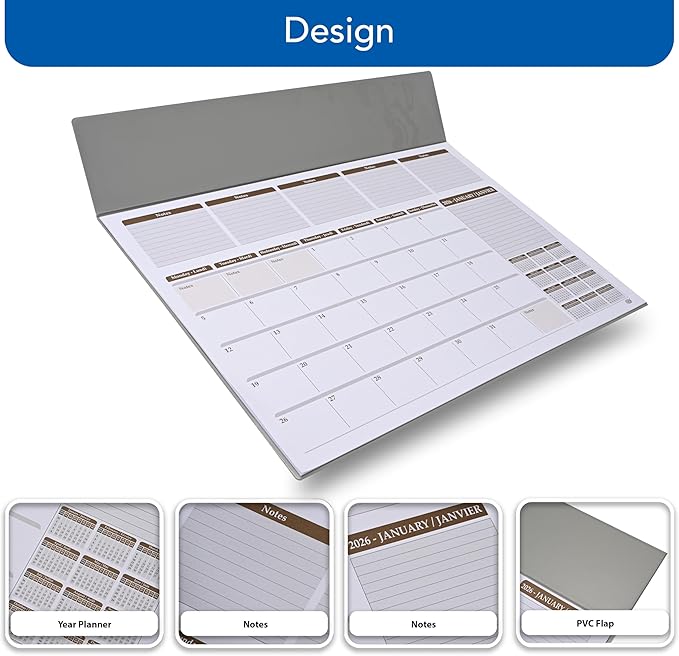 FIS Grey PVC Desk Planner 490x340mm English-French 2026 Desk Planner | bilingual 2026 planner FSDK2EF26GY
