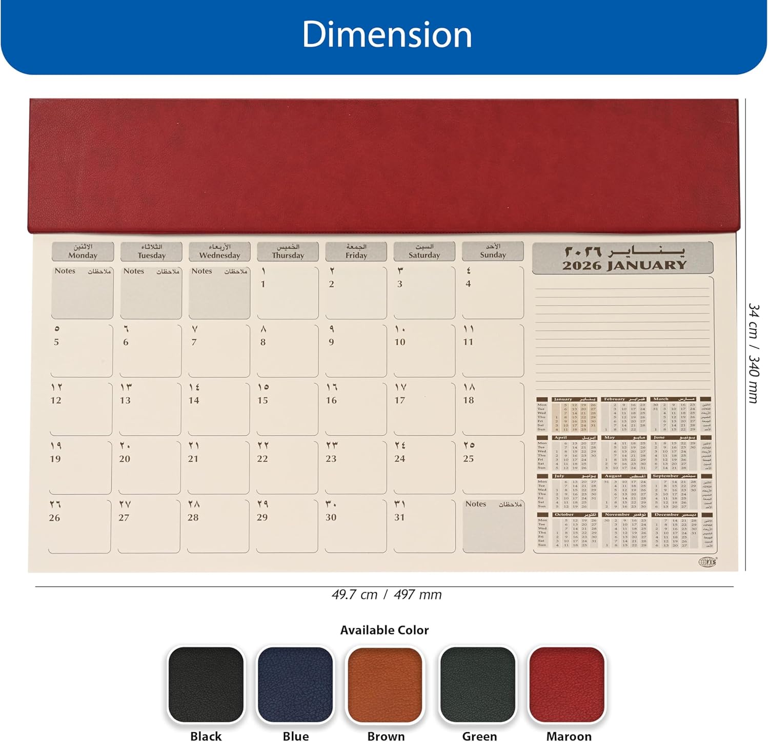 Good purchase factors include the large 490x340 mm format for clear visibility, a durable maroon PVC cover, and a bilingual Arabic-English setup that supports multilingual planning needs. The 2026 calendar coverage makes it suitable for year-long use in diverse settings, offering practicality and versatility in a single desk planner.