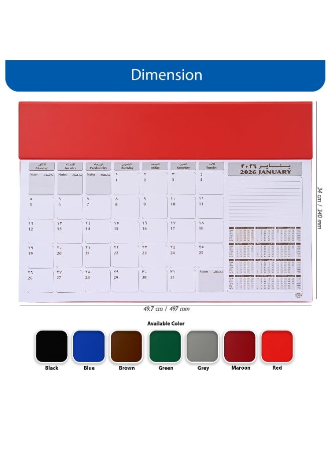 Large 2026 bilingual desk planner in red PVC with a 490x340 mm footprint. Practical, durable, and desk-ready for daily planning over the year.